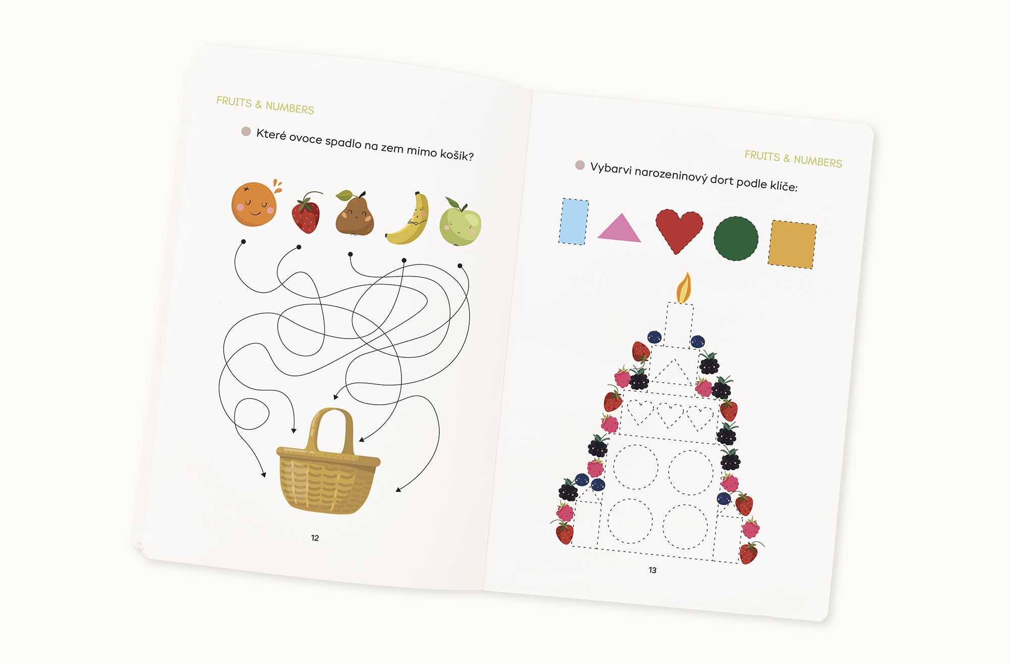 Zábavný pracovní sešit pro děti plný úkolů zaměřených na počítání, logiku a rozvoj grafomotoriky. Na 28 stranách najdete celou řadu aktivit – od hledání rozdílů, spojování správných stínů a vybarvování nebo jednoduché početní úkoly s ovocnými motivy.