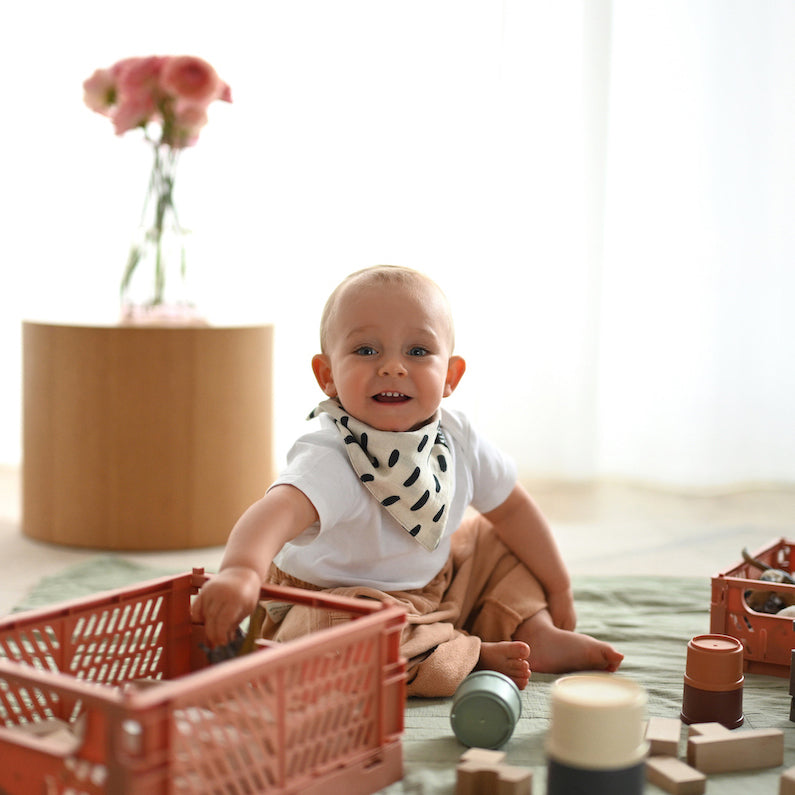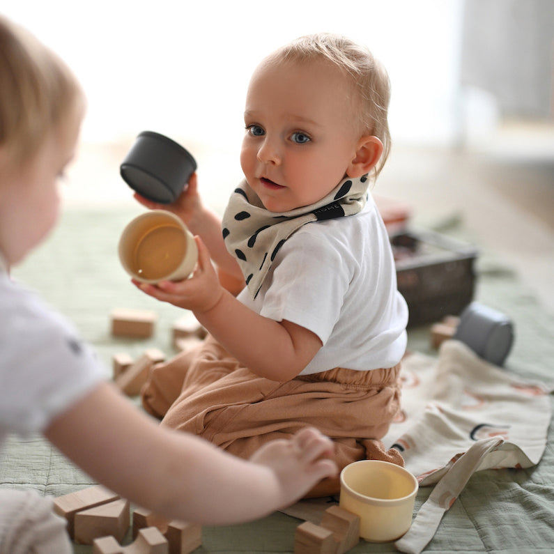 Oboustranný šátek je skvělým módním doplňkem pro vaše nejmenší. Šátky jsou velmi praktické, když děťátku rostou zoubky a více sliní, jeho oblečení zůstane suché a vy mu můžete jen vyměnit šátek. Když se vaše děťátko umaže při odpolední svačince na hřišti (a co si budeme povídat stává se to často) stačí šátek jen otočit a hned je outfit zase dokonalý. Šátky jsou vyrobeny z jemného mušelínu, který děti při nošení nedráždí. Dva praktické patenty, umožňují zapnout šátek na dvě různé velikosti. Balení obsahuje šátky ve dvou designech, kapky deště a krásné duhy v odstínech béžové jsou univerzální a stylové.